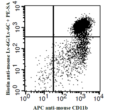 | C57BL/6 mouse granulocyte of bone marrow stained with APC anti-mouse CD11b and Biotin anti-mouse Ly-6G/Ly-6C, followed by PE-Streptavidin |